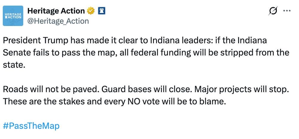 As I wrote before (and reprinted* in the Terre Haute Tribune-Star), this is actually in Indiana Republicans’ self-interest. The map would have moved 36% of Hoosiers into a new district - a major disruption. Despite radical threats from Trump to withhold federal aid from Indiana, and despite visits by Vice-President JD Vance, the state Senate left in place a map that elects two Democratic Representatives, including one from the city of Indianapolis. Indiana is now hedged against the probability that next year, Democrats will retake control of Congress.