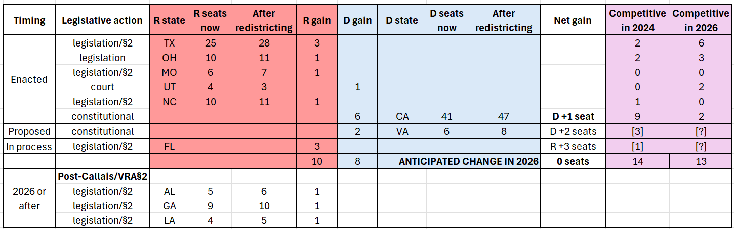 In other news, the approval of Proposition 50 in California will lead to a net gain of about 6 seats for Democrats. Combined with Utah, the advantages gained by Republicans in Texas, Missouri, and Ohio are fully neutralized - but at the cost of reduced competition.