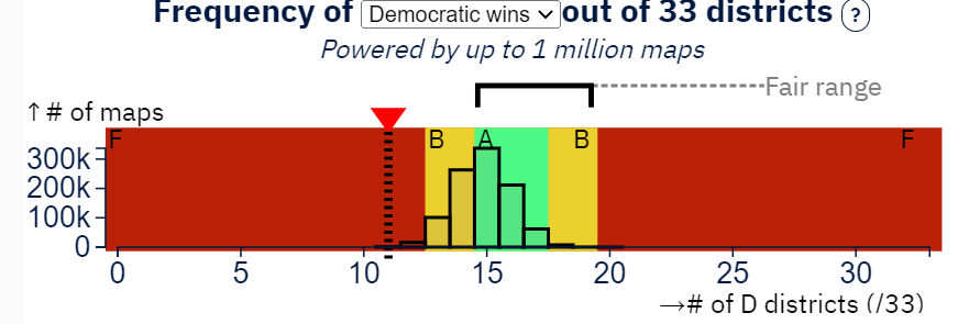 This didn’t happen by chance. The histogram shows the results of 1 million simulations of randomly drawn maps. Such a lopsided outcome would arise by chance well under 1% of the time.