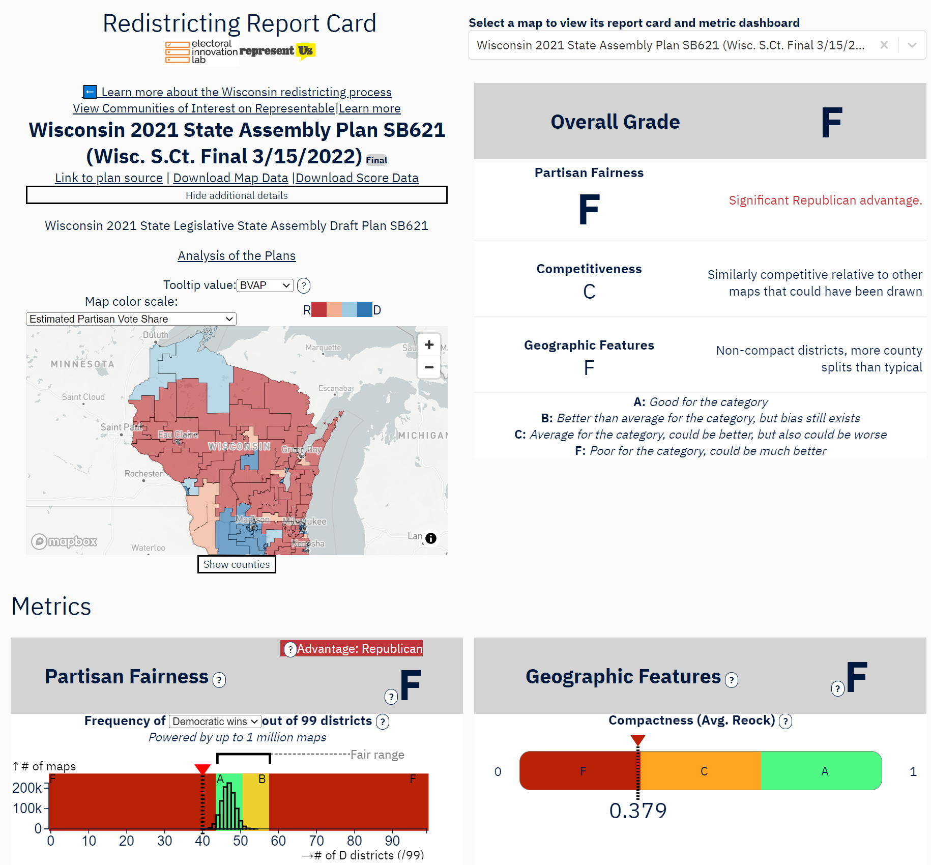 To show you how much difference a single vote on the Wisconsin court might make, here are some maps scored by the Princeton Gerrymandering Project. The differences are striking.
