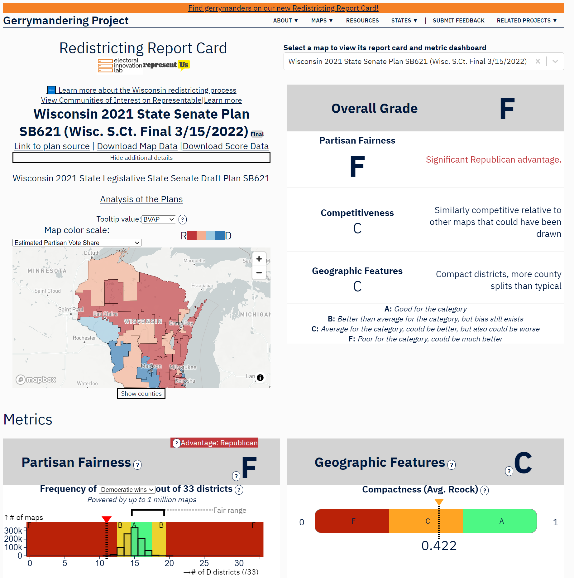 They’ve been increasingly hostile to the use of the Voting Rights Act to draw districts dominated by minority voters. With just a few weeks until primary elections were scheduled, they overruled this map and turfed it back to the Wisconsin court to try again. Having nearly run out of time, the Wisconsin court accepted the legislature’s map. So Wisconsin’s final grade is an F.